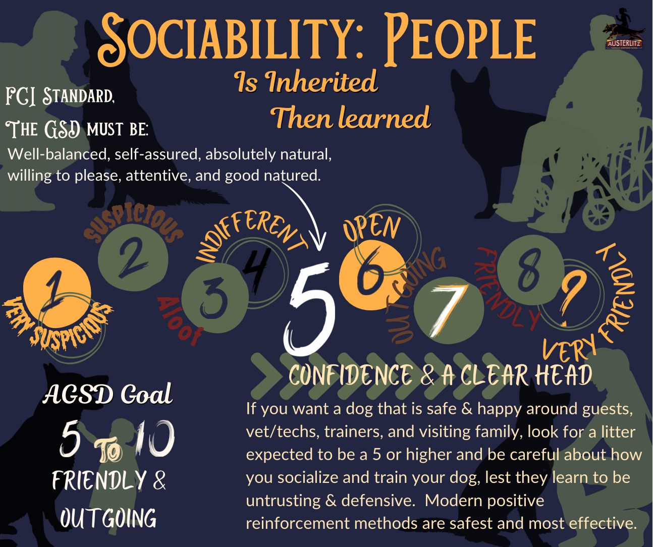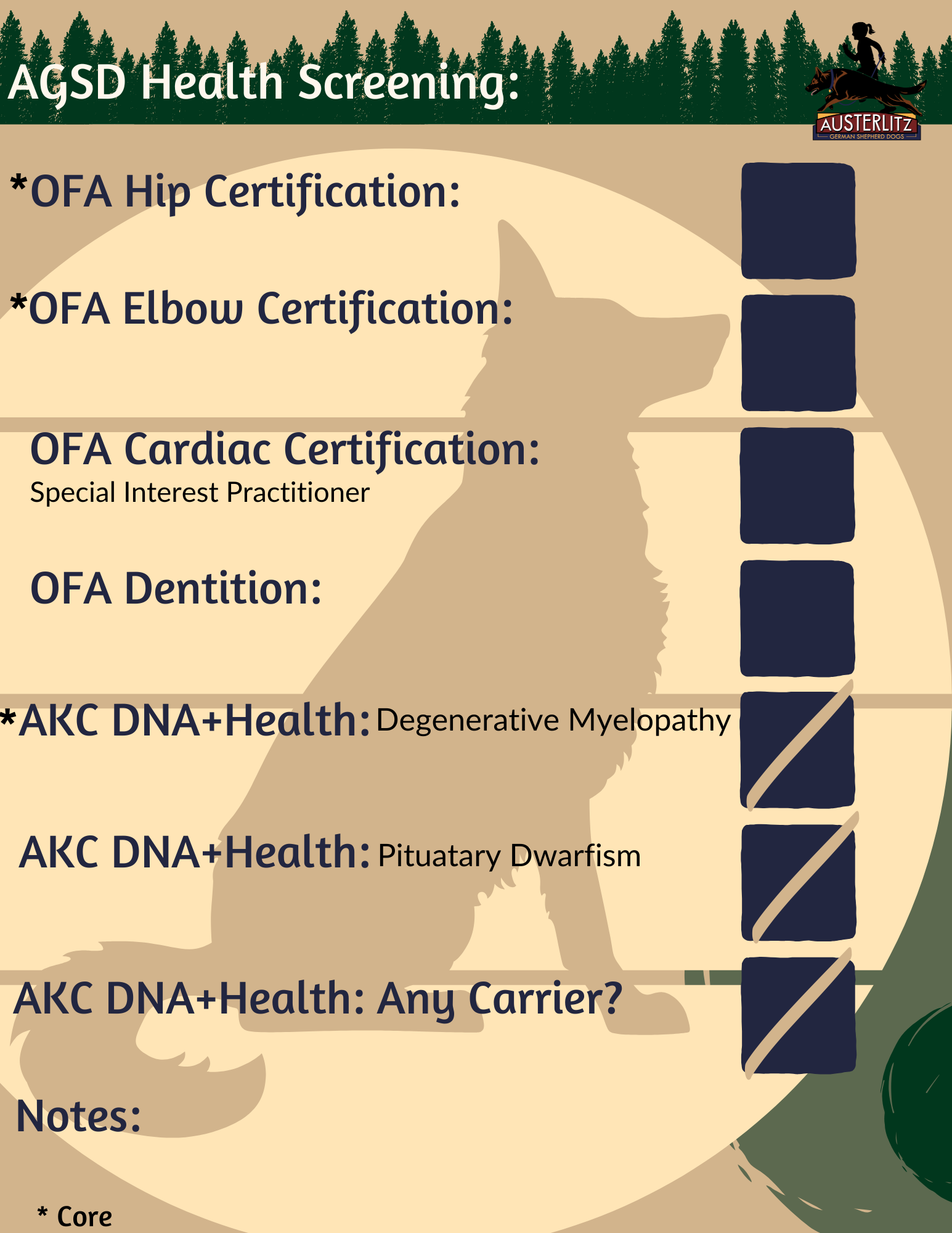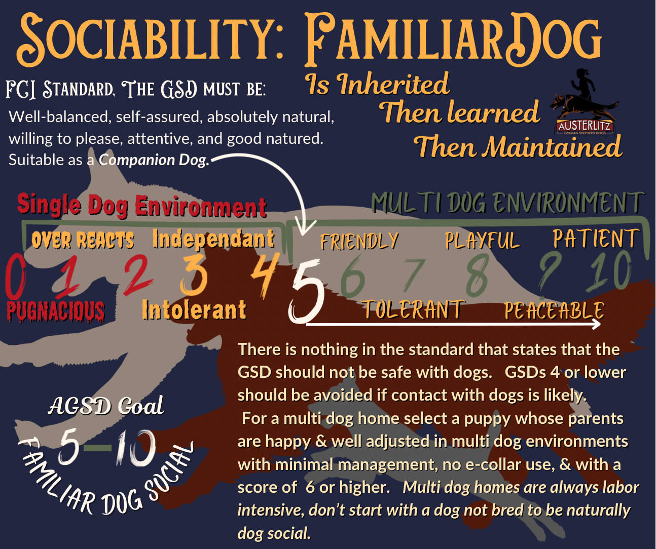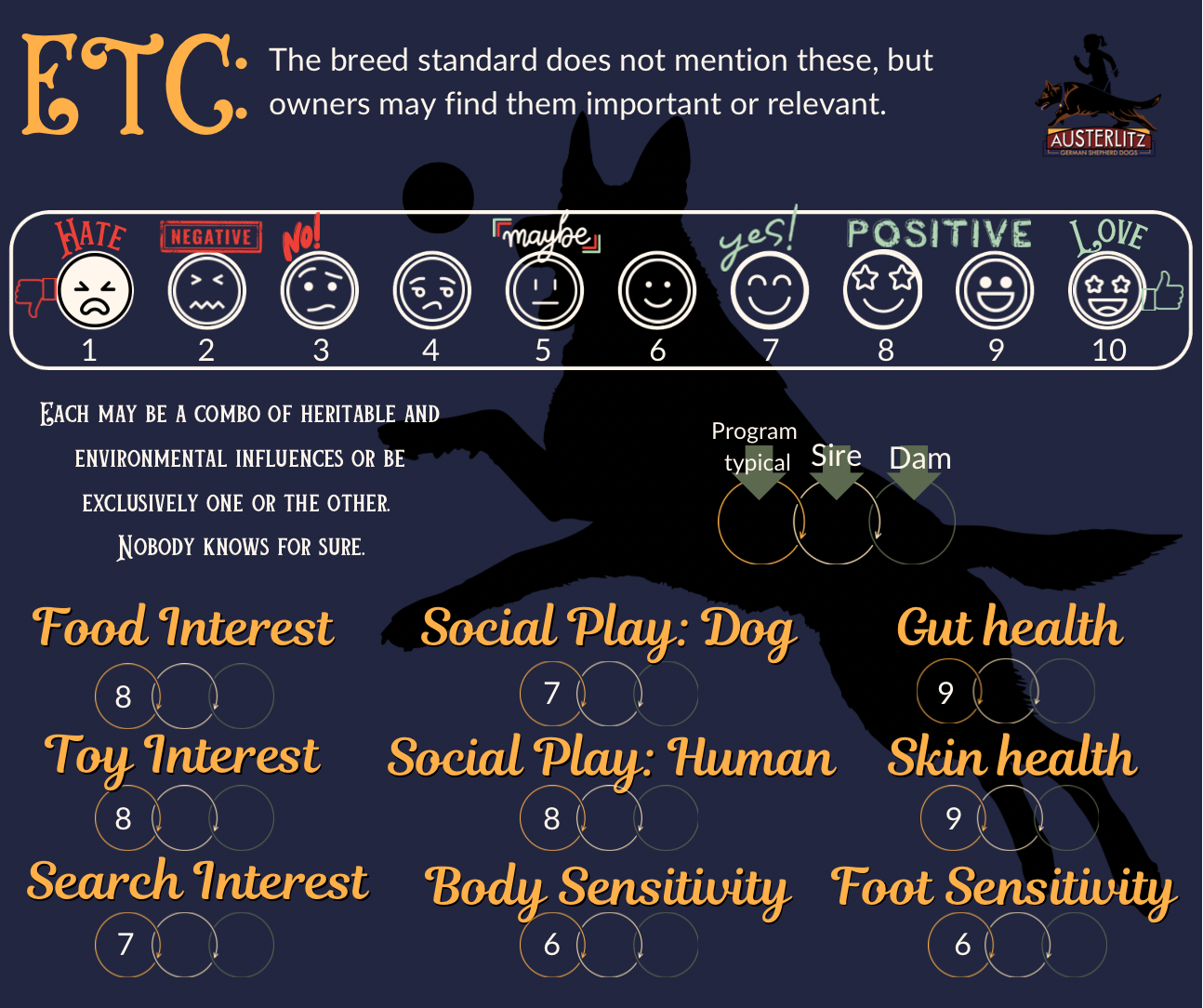 In the name of transparency and communication we use a simple scoring system to plot our breeding dogs, and litters, important heritable traits of health based on FCI and GSDCA recommended screenings. For behavior we use our own system, using breed typical traits so you can clearly and easily look at a parent dog, or their breeding, and see if the expected traits are going to be a good fit for your needs and desire for a pleasant GSD companion. These are based on our extensive experience with the breed and our program dogs, as there is no worldwide system for behavioral health as there is for physical health.