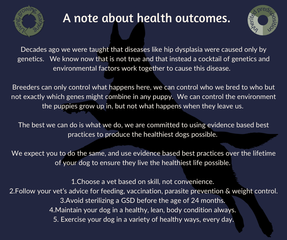 5 Health Conditions: The predisposition to certain health condition is also generally accepted to be inherited. Breeders have long avoided breeding dogs with certain health conditions together, even when those conditions are not clearly understood and evidence for inheritance is absent. While puppy seekers don’t need a crash course in genetics to find a puppy bred for good health they do need to understand that there are worldwide standards for health “best practices” for decreasing heritable health conditions in purebred dogs and that we at AGSDs follow these recommendations marked below with *(specifically the FCI, WUSV, and SV guidelines as these are evidence based and set recommendations for kennel clubs worldwide) including guidance from the GSDCA as the parent club for the USA. We screen all breeding dogs for hips, elbows, heart, plus DNA testing for DM (among others) and for normal bite/dentition.