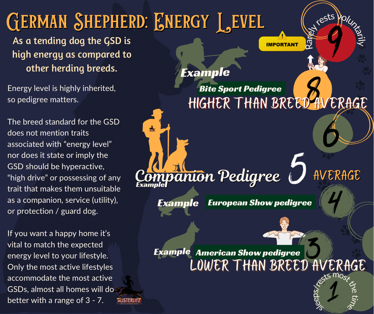 3. Energy Level: This is also inherited, and we don't want to live with hyperactive dogs any more than you do. In fact nobody wants a dog in their house without an “off switch” (an inability to rest on their own, a hyperactive dog) - many dogs like this were never intended to be kept in a home, rather are expected to live in crates or kennels primarily.