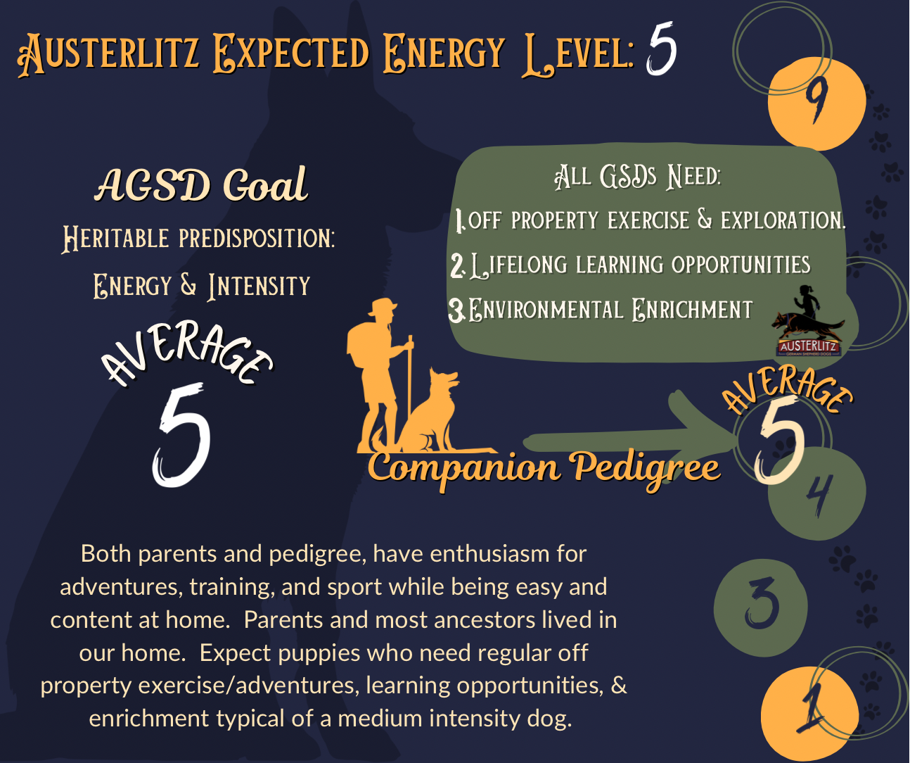 We have a scoring system we use to help communicate to puppy seekers the energy level of a particular parent dog and also what we expect for that litter.