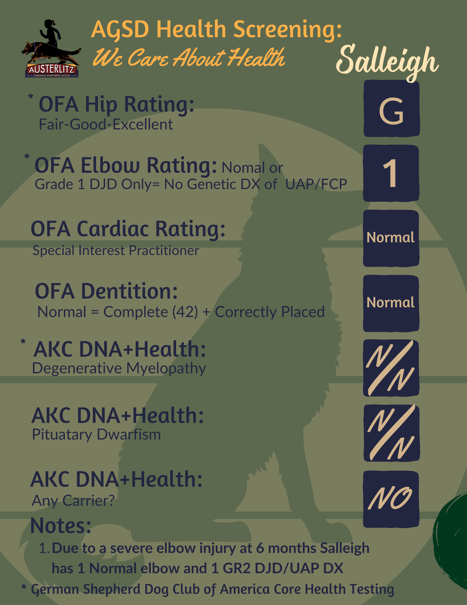 Salleigh's pedigree is a mix blood out cross with German working lines from her sire Rambo, and German show lines from her mother Indeigh. Her tail female line goes all the way back to Susanne's first GSD Quinta v Westfork, through Frisco v d burg Austerlitz to Amy Arnoux -Bette Arnoux to Quinta- Andeigh- and Iveigh and she is a great representative of this line moving forward.