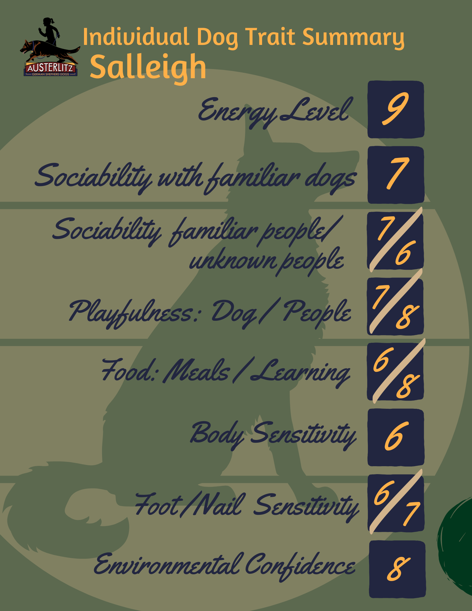 Salleigh has her dad's physical type, and her mothers personality and drive make up. Salleigh is a busy girl when there is something fun to do, and a chill girl when their isn't. She loves to chase squirrels, herd her friends around, and get into everyone's business.